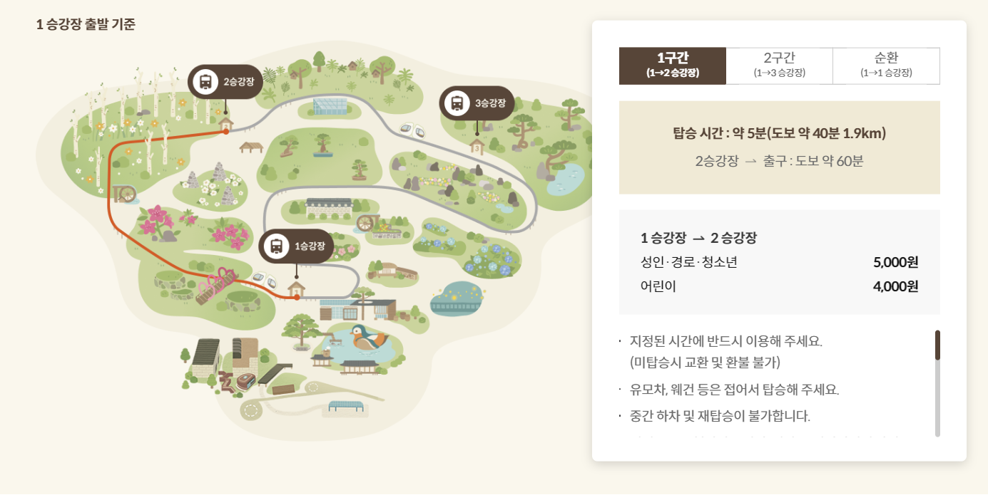 구간별로 모노레일이 운행되고 있으며 1구간만 구매 후 2구간, 3구간에서부터는 발권하여 이용 가능합니다. 한 구간마다의 도보 소요시간은 약 1시간 정도이니 시간을 잘 안배하셔서 자연의 정취를 편안하고 고스란히 받아가시기 바랍니다.
